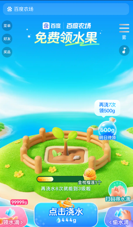 1.用户进入百度农场,可以在页面展示的水果中自行选择一种水果作为种子进行种植,具体的水果类型以页面实际展示为准;活动期间内,每个用户只能同时种一棵果树;