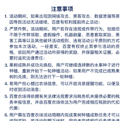 3.用户种植果树后可通过做任务获得水滴奖励,详见活动任务说明;种植过程中,用户也可以参与领取水滴等活动任务,具体奖励数量以页面展示为准;百度农场会随着活动的进行更新不同的活动任务和玩法,具体活动任务内容和奖励以呈现在页面的展示为准。