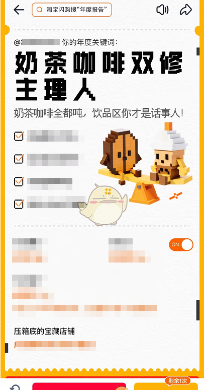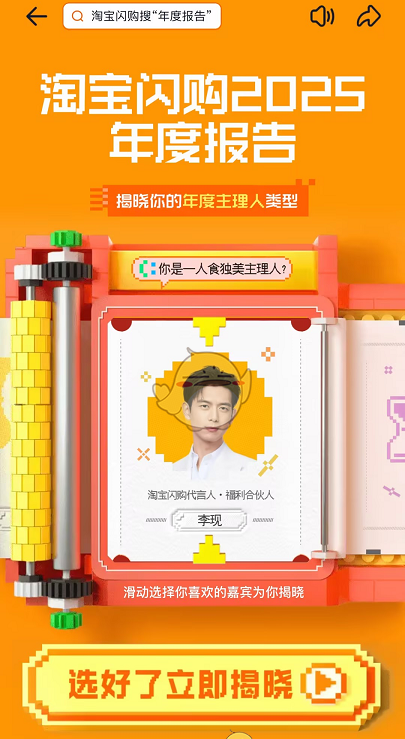 查看2026淘宝闪购年度报告,可现在上淘宝APP,在搜索框输入“年度报告”,进入活动页面解锁主理人身份,还能选择淘宝闪购代言人杨幂一起开启年度报告,查看消费金额、省下费用、抢免单券次数等信息,看完后可在右下角抽奖。