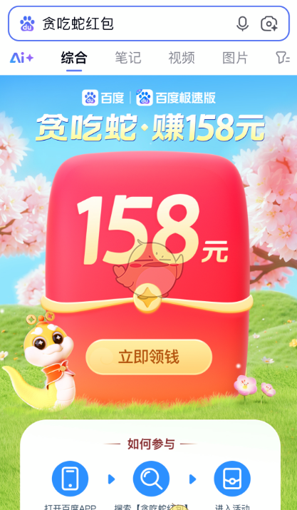 2、或者通过百度APP-搜索【贪吃蛇红包】同样可以进入活动。