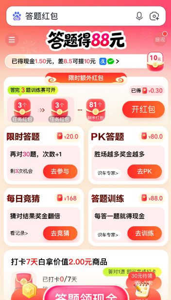 >>>百度答题红包88元提现教程