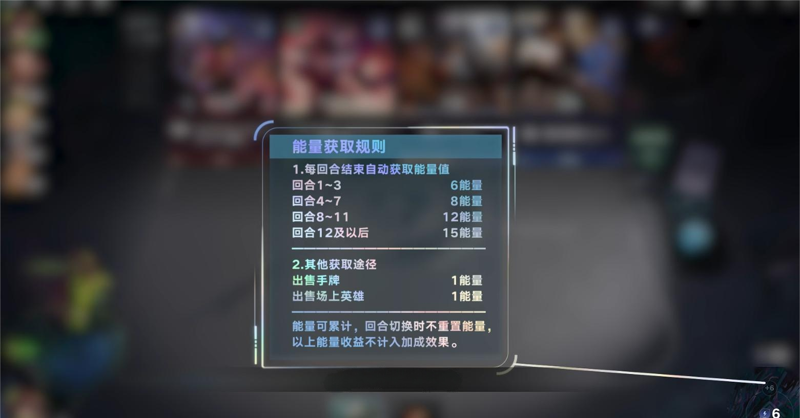 能量的获取规则就是和下图所描述的一样,随着回合数量不断增加,也就是说随着对战的时间不断的增加,但是要注意的就是对战的能量不会随着持有的数量增加,也就是不会有利息的产生,所以不玩特殊的手段每位玩家能获取的数量基本上是一样的,这也就对玩家的经济控制能力有所考验了。