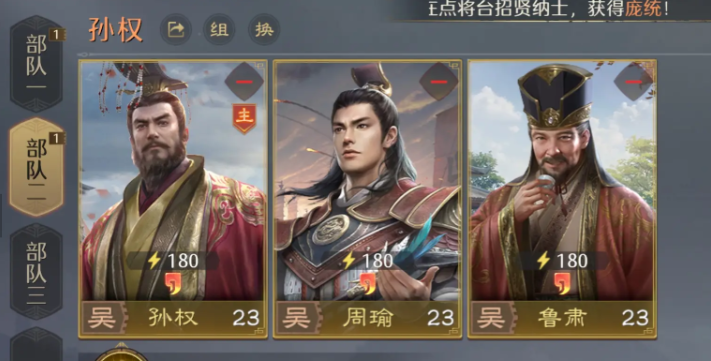 在搭配阵容时,可以选择周瑜、鲁肃,还有孙权等人。在这一个阵容中,孙权是主将。核心的作用是加快全队的技能循环,所以技能选择上应该要兼顾怒气回复,还有兵力续航。可以给孙权加怒气技能,可以让他更快的释放虎踞江东技能,同时搭配一个伤害回血技能。在保证输出的同时,还可以维持自身的兵力,可以避免过早退场。孙权的兵力,还有骑兵的士性,全部都是s级,领兵达到14,200,统帅还有智力的属性都是很亮眼的,可以扛起主将的重任。