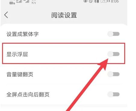 进入阅读设置界面后,开启【显示浮层】即可,如图所示。