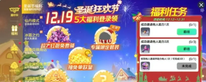 圣诞盛典将会带来5大福利,第一个就是从12月19日到12月25日,玩家能连续领取7天圣诞超大红包,没有什么任务需要完成只要登录,就可以开红包拿奖励,成功邀请好友进行助力,还能收获更多奖励,最高玩家能开出99把。