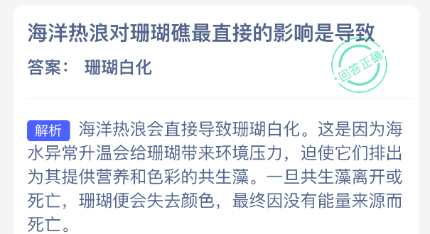 以上就是海洋热浪对珊瑚礁最直接的影响是导致?蚂蚁森林神奇海洋今日答案2025年12月18日分享,更多相关攻略内容,请点击关注更新!