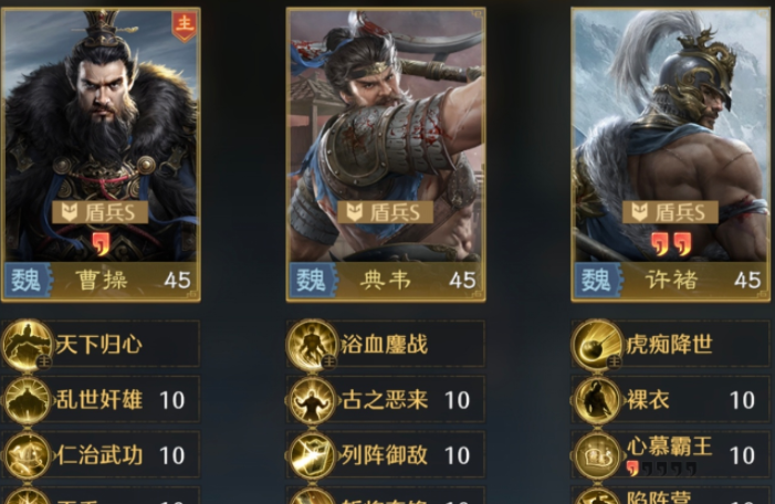 在游戏里想要组建反击盾的阵容,最推荐的就是选择魏国阵营里的角色,在这个阵营中可以把曹操,典韦和许褚这三个角色搭配在一起,首先这三个角色都是盾兵,组合起来能有非常强的抵抗能力,每个成员在队伍里都能起到不同的作用,曹操在游戏里可以提供治疗和减伤的作用,利用这个角色的技能,可以增强整个队伍的续航能力,整体的伤害也能得到一定的提升,即便是新手玩家也能借助曹操的能力,让自己有更强的抵抗力。