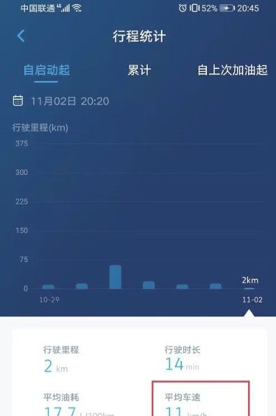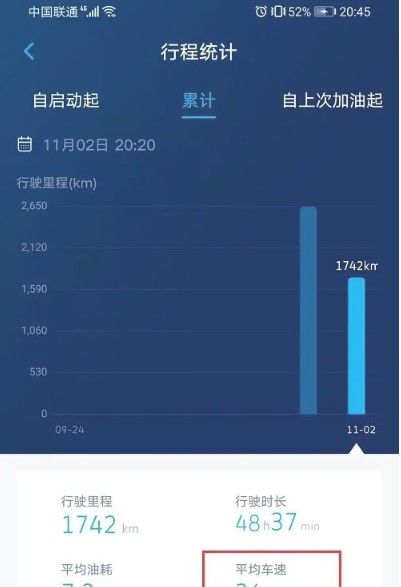 进入行程统计之后,可以看到自启动起的平均车速