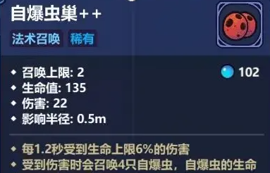 自爆虫巢受到伤害和死亡时会生成自爆虫,自爆虫属于召唤物可以触发【尸爆术】,自爆虫继承虫巢30%的生命值,我们可以通过【巨魔血清】和【灵魂链接】提高自爆虫巢的生命,从而提高自爆虫的生命值。