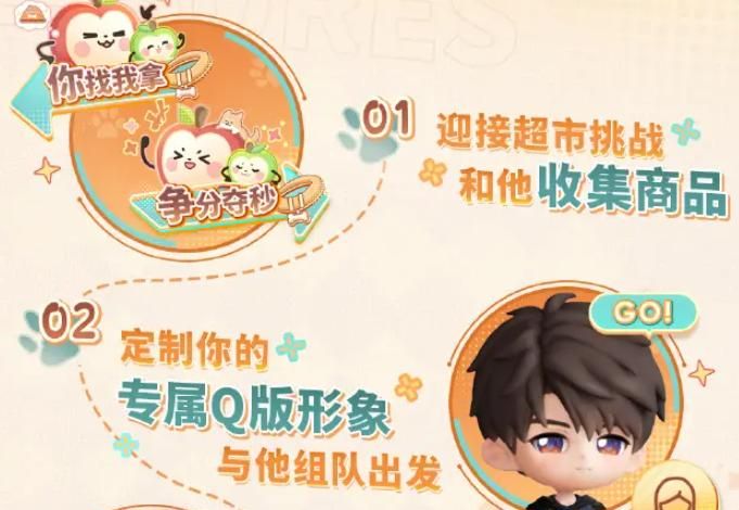 先是和夏以昼一起整理货架,然后完成超市挑战,收集商品。然后是定制专属Q版形象,和夏以昼一起组队。再就是体验活动专属剧情,一起携手挑战宠物救助公益赛事。
