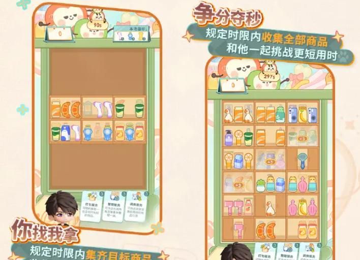 挑战中,需要将3个相同商品放置在同一个货架,这样就可以完成商品收集了。如果遇到难处,可以合理使用求助机会,呼叫店长服务。要在规定时间内收集全部商品,一起挑战更短的用时。一个复杂找一个复杂拿,收集全部商品可以得到更多的积分。