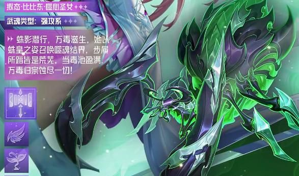 斗罗大陆猎魂世界噬魂蛛皇怎么样?斗罗大陆猎魂世界噬魂蛛皇是在1.4版本推出的全新武魂,于12月18日正式实装,其拟态形象是大家熟悉的“噬心圣女”比比东。那么这个武魂怎么样呢?作为非常典型的毒系流派武魂,其技能设计也是围绕着持续叠毒、长线收益展开的,整体来说是有较高上限的持续输出型武魂。