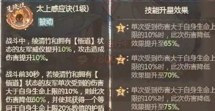 5、星级技·太上感应诀:绫清竹与“悟道”友军威仪提升10%,攻击伤害提升10%。单次受到伤害大于自身生命上限10%时,伤害降低60%,并获得等同于自身20%生命上限的护盾(持续5秒),极大提升主C生存能力。