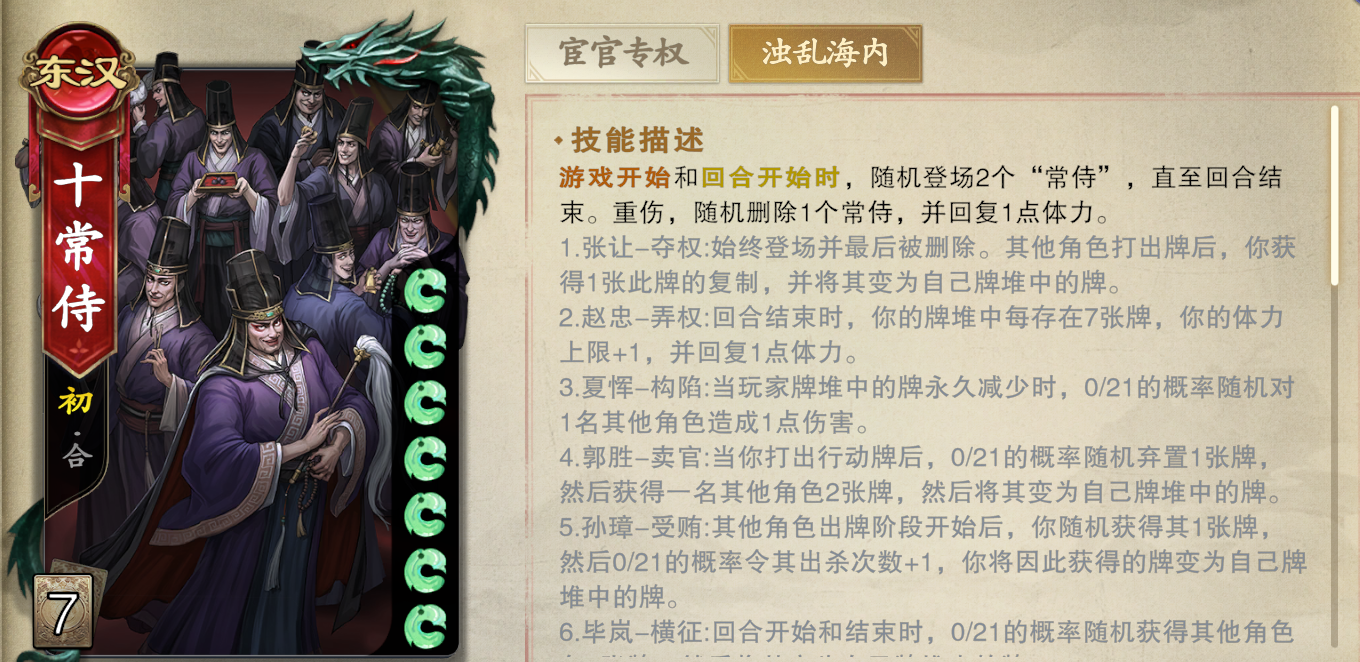 第二个技能就是可以给十常侍的其中两名侍卫赋予技能,这个技能效果不唯一,但是这些侍卫会获得跟玩家们一张的卡牌数量,导致玩家们打起来会非常地墨迹,几乎是无法短时间击杀的,所以就需要持续地进行消耗。