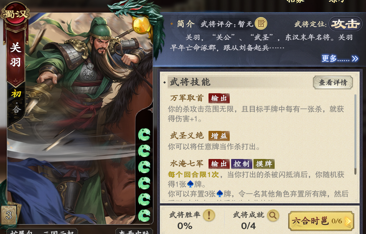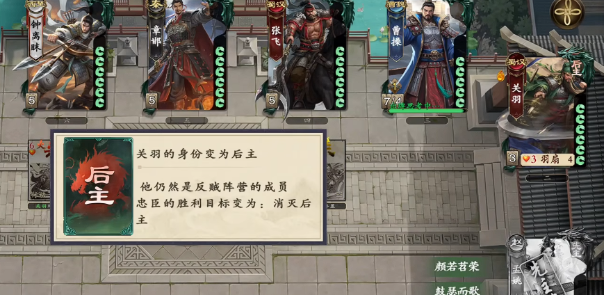 而刘备的话就是能赠送手中的卡牌,基本上每个回合刘备的卡牌可以全部送给关羽,这样关羽就拥有足够多的手牌,这就意味着关羽一回合甚至可以出到7-8张杀,再搭配一些技能以及武器牌的话,可以在几个回合内将十常侍的血量打到残血。