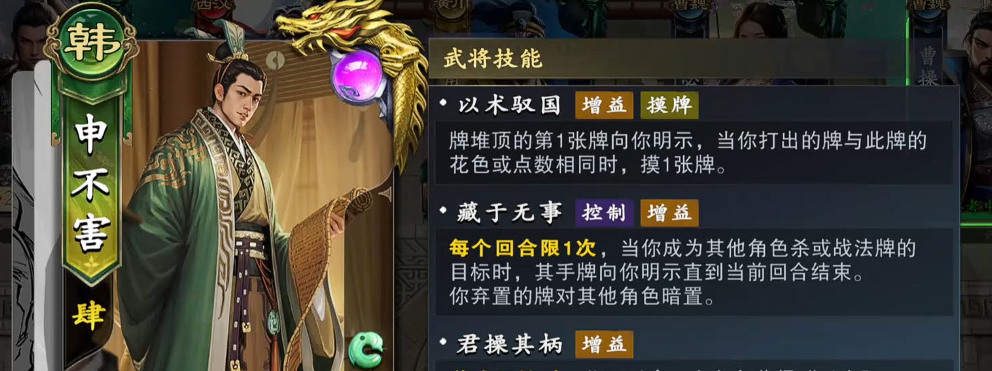 首先来看申不害的技能,他的定位是一个干扰性武将,其中技能1君操其柄类似于绑定效果,开局能选一个队友,让他和自己都拥有 “以术驭国” 的效果,只要自己或队友没阵亡,该效果就能一直在,这样就可以跟鲁肃绑定在一起。