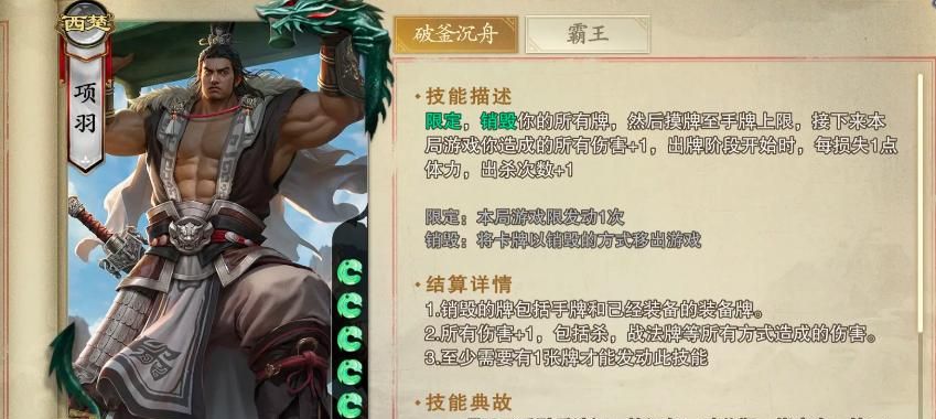 先看来“破釜沉舟”这个技能的效果,这是一个限定技能,只能发动1次,会销毁所有牌,然后摸牌至手牌上限,并且在接下来本局游戏所造成的所有伤害加1点,并且在出牌阶段开始,每损失1点体力,出杀的次数加1。