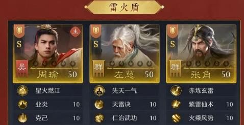 雷火盾的核心输出位为周瑜,其技能机制天然适配雷、火双系增伤与状态叠加。辅助位固定由左慈与张角组成:左慈主司雷系伤害与控制效果,张角负责火系持续灼烧与群体压制。二者配合周瑜的AOE技能,可高频触发“雷引火势、火激雷爆”的连锁反应,形成多段叠加的持续伤害结构。兵种方面,必须选用盾兵——该兵种不仅提供基础承伤能力,更能在集结战与野战中稳定发挥,尤其对阵弓兵、器械类队伍时具备显著克制优势。