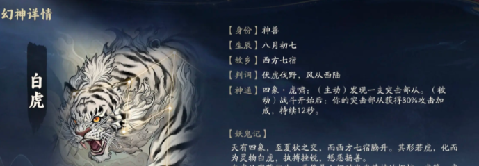 游戏里的幻神角色有很多,白虎是一个相对来说比较灵活的,在挑战的过程中,白虎可以主动发现突击部队,这样在了解对方的情况之后,大家也能更加快速的组建属于自己的突击部队,对战的时候,这支部队还能获得额外30%的攻击力,非常适合在前期对战的时候,快速提升自己的能力,但这个幻神只适合在游戏里想要快速上分的玩家,假如喜欢的是相对比较长久的对抗,那就可以考虑选择其他的幻神角色。