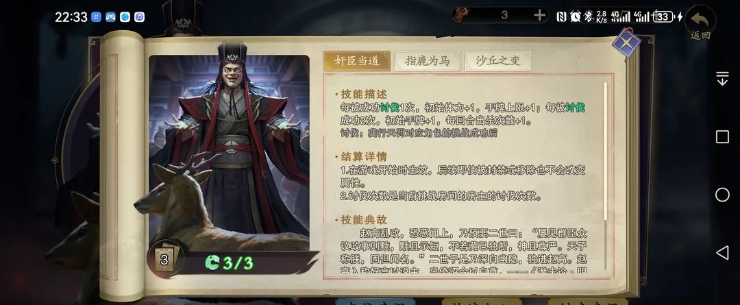 正式开启对赵高的讨伐以后,玩家一定要清楚的知道赵高的技能效果,赵高的一技能奸臣当道,每成功被逃犯了1次以后,赵高的初始体力、手牌上限都会分别加1,每被讨伐成功2次时,初始手牌会加1,每个回合出杀的次数以会加1次。