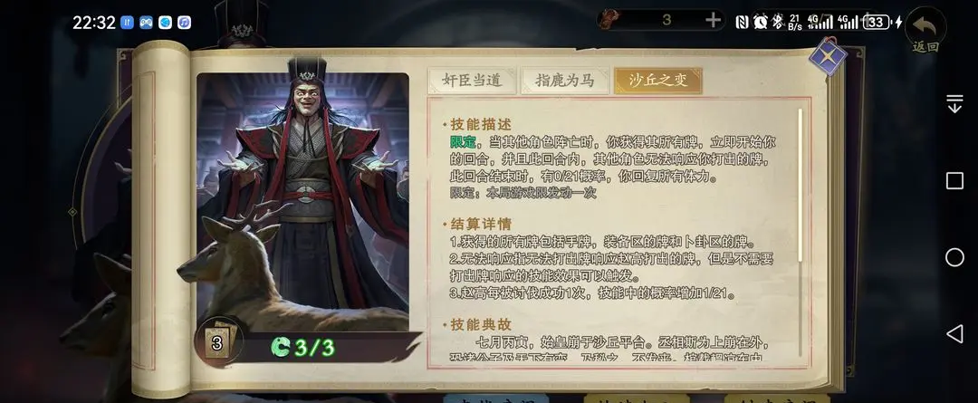 三技能沙丘之变会有角色阵亡的时候被触发,当有角色阵亡时,赵高能够获得阵亡人的所有牌,而且在本回合的对局中,其他角色对于赵高打出的牌还根本无法相应,为此,大家应对这个个技能最好的方式就是减少伤亡情况的出现,一旦有伤亡出现,赵高将会进入到猎杀时刻。