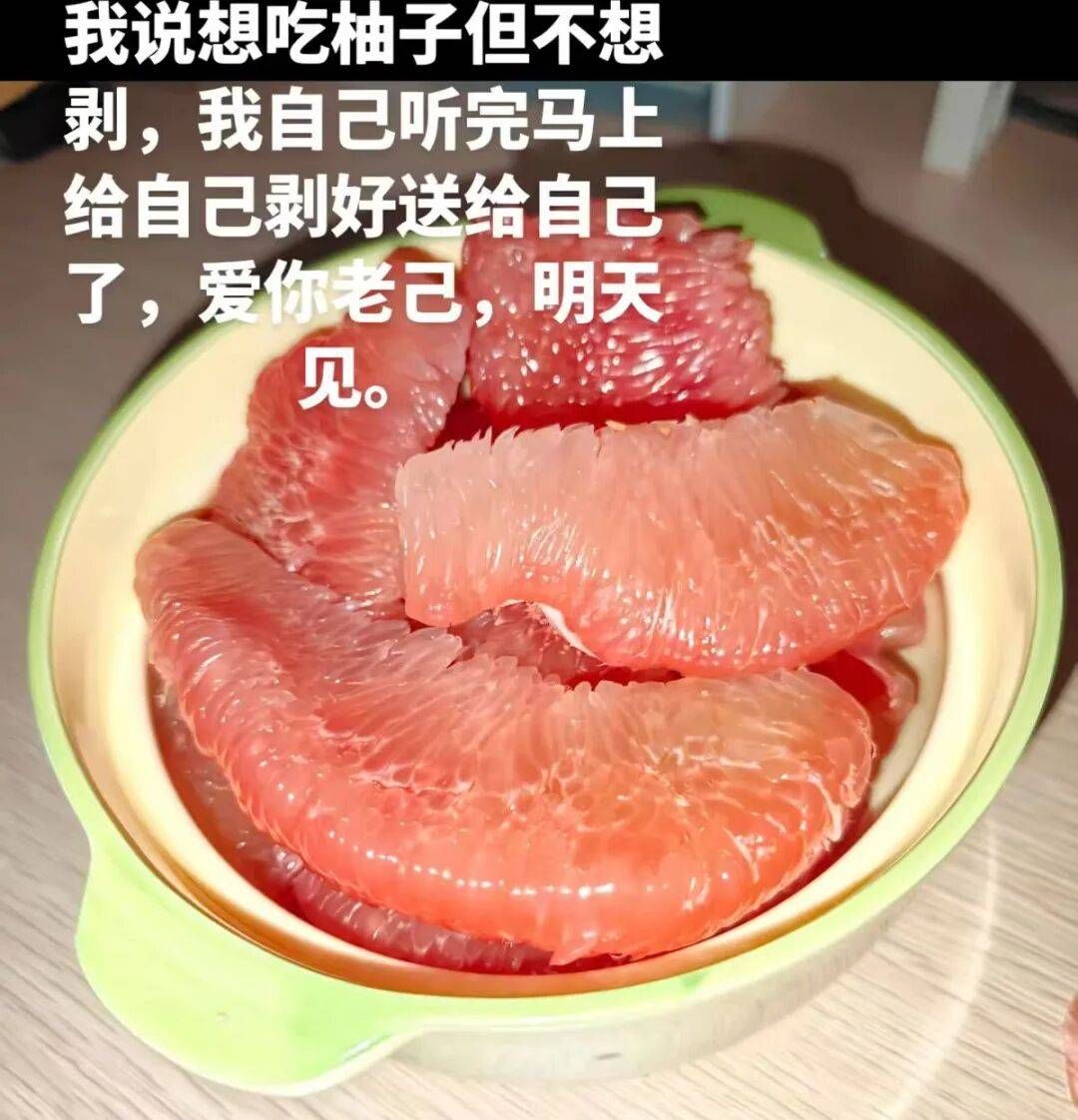 “爱你老己”的流行,始于一个生活化的短视频场景:博主为自己剥开本想放弃的柚子。“我说想吃柚子但不想剥,我自己听完马上给自己剥好送给自己了,爱你老己,明天见。