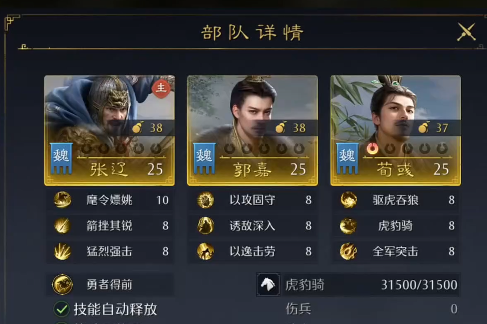 整套阵容的高频输出根基,源自荀彧的主动技能“驱虎吞狼”。该技能设定为:当己方任意武将释放主动技能或突击技能时,有固定概率触发效果——一方面恢复部队兵力,另一方面对目标追加一次谋略伤害。在张辽高频提供连击的前提下,“驱虎吞狼”的触发频次显著提升,从而形成“连击→触发→再连击→再触发”的正向循环,大幅提升单位时间内的总伤害量与续航韧性。