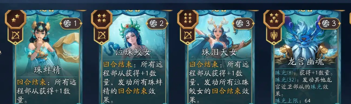 在龙宫就会有许多核心的流派,其实每一种流派都会有明确的玩法逻辑。那第1种就是暴兵流,又被称之为秒杀的机器,核心就在于要把珠泪天女,还有朱雀以及龙王等角色放在一起,可以形成羁绊。这几个简直就是远程部队的战斗力放大器,每一个回合结束之后,还可以叠加数量加成,可以说简直就是越打越猛,后期就能有效实现秒杀的快感。前排原本还计划用龙宫幽魂,可以靠着他回合结束之后的效果,能有效补充增益。后来又发现纯远程流,可以完全放弃前排,可以多拿三位女将,战斗力刷起来之后,根本就不需要担心贴脸,确实是比较省心高效的。在过渡阶段就可以选择沙蝎,可以有效增加金身,带来更好的叠加作用。