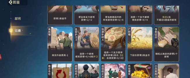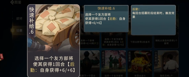 可以先从基础的资源来说,获取一枚金币,这就是前期过度的蚊子腿。不过在连胜局中,可以靠着慢慢的积累,还是比较有优势性的。全友方部将获得提升,这就是中期比较优势的存在,尤其是搭配群攻阵容,全员的属性抬手就可以直接碾压强攻队伍。商店内所有部将提升,这就比较适合于赌高费卡,在锁定商店刷核心时,就可以顺便把所有的属性叠加起来,成型之后,简直就是碾压级别的面板。
