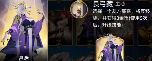 吕后就是一个金币制造机,移除友方部将之后就能赚到三金币。在升级之后卖掉高星卡,收益还可以直接翻倍。前期优先拿上阵招募效果的武将,触发效果之后就需要立刻卖掉。理财的同时还可以保证战斗力。