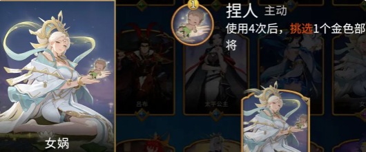 女娲的捏人技能也被称之为理财神器。使用4次就会送金色的部将,星级还会伴随着商店等级去浮动。4个回合,8个回合,12个回合触发,性价比还是比较高的。开局空城,不要盲目去拿卡,如果遇到李秀宁或者是李元芳,那么拿卡才比较合适。就算没有开到高费卡,也可以靠优质卡碰六稳阵,技能可以重复的使用。成型的速度就会超过其他的统帅。