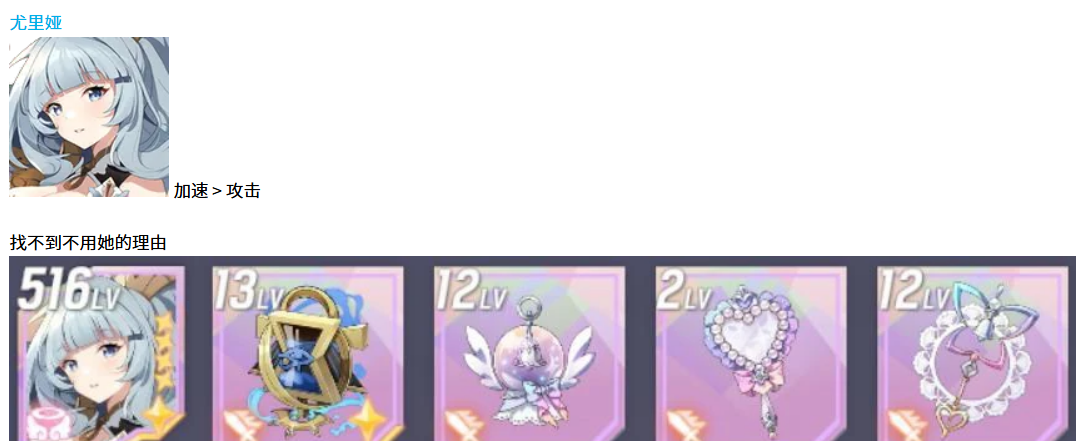 先说尤里娅这个角色,她在天使型里的地位基本上是无可替代的。配装方面主要看两个属性,加速是第一优先级,其次才是攻击力。为什么要这么选呢,因为尤里娅的技能机制决定了她需要频繁出手,加速堆得越高,回合轮转就越快,能够更多次触发她的辅助效果。攻击力虽然也重要,但排在第二位,毕竟她不是纯输出位,主要还是靠技能来带动队伍节奏。装备选择上优先考虑带加速词条的套装,副属性也尽量往加速上靠,这样才能把尤里娅的作用发挥到最大。