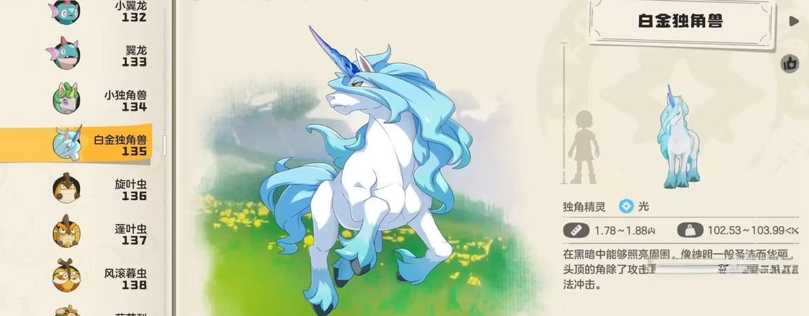 白金独角兽在陆地坐骑中是移动速度最快的一类坐骑,也可以说是陆地坐骑中的顶配坐骑了,在平原地区骑乘白金独角兽的话,能够感受到犹如风一样的奔跑速度,不过该精灵需要玩家在游戏的中后期才能捕捉到,而且培养起来比较困难。