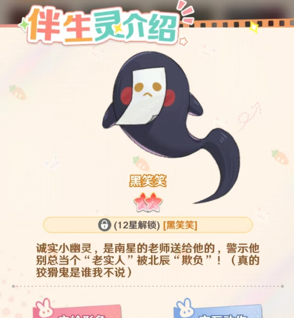 南星给人的第一印象就是理性克制,他的特质是智星,代表智慧和统筹能力,在经营玩法上一般对应全局型加成和关键节点增幅的能力。南星的伴生灵“黑笑笑”达到12星以后解锁,诚实的小幽灵不仅可以和角色一起行动,还可以变成相机增加角色的互动性以及收藏价值,同时提高了南星作为一个高级店员的完整性,使角色在功能以外更加有沉浸感。