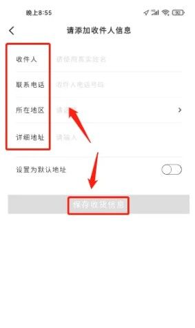 进入请添加收件人信息,输入收件人、联系电话、所在地区、详细地址窗口,点击“保存收货信息”