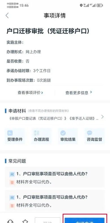 选择城市,点击在线申请,可以进行办理户口迁移申请