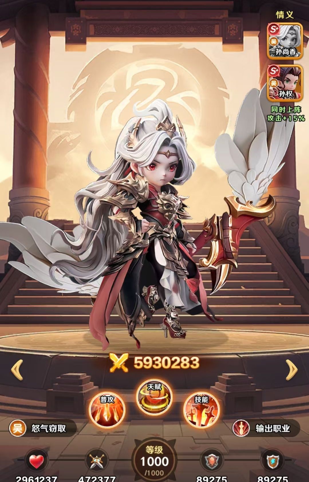 孙尚香是属于巨神军师中东吴阵营的核心武将之一,自身的定位是群体物理输出和怒气控制,既有清场能力又具有团队回怒的能力。该武将在达到九星之后才能实现质变,适配东吴灼烧体系和各个场景PVP选择。在实战中的定位就是群体物理输出,是一个比较稳定的副c兼团队的节奏选手,也是东吴国家队的刚需。孙尚香的普攻是稳定的单体伤害,小技能单体伤害比较高,积攒怒气快,大招可以攻击对方全体,除了造成物理伤害外,还有几率偷两名目标的一点怒气。这样既可以打断对方的大招,又可以加速己方循环。