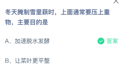 以上就是冬天腌制雪里蕻时,上面通常要压上重物,主要目的是,支付宝蚂蚁庄园2025年12月30日答案最新,更多精彩内容,请点击关注更新!