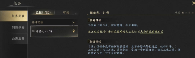 要想结婚,首先要是不同性别的两个角色,等级都达到35级以上,友好度达到5000以上,这是硬性条件。只要满足了这些条件,双方沟通好之后,就可以组队前往三生石处领取定亲任务。一方对另一方使用道具情定三生,对方在60秒内点击确定及定亲成功。在定亲成功之后,好友列表中会增加定亲标识,定亲之后才可以去申请结婚。三生石的数量比较多,在九黎、巴蜀等都有分布。九黎的三生石是在丹朱村,巴蜀的是在女娲宫,自动寻路前往之后就可以操作。