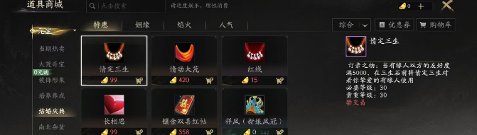 完成各种任务完成之后就可以领取到结婚证了,后续还有环节,例如花轿送喜和百年好合等。这两项都是额外付费的服务。可以根据选择的花轿种类,提供一定的金钱及选择路线。百年好合需要直接消耗金币和可抽取物品,然后让其他的玩家去抽红包。