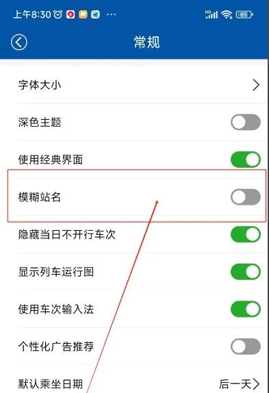 在跳转的新界面中点击“模糊站名”右侧的按钮,当按钮颜色变成灰色,在表示关闭该功能成功