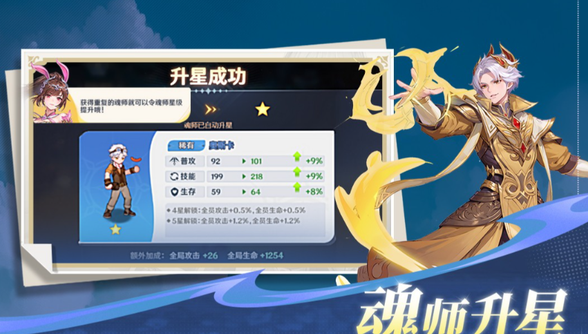 当小伙伴们收集同阵营的魂师达到一定数量的时候,是可以获得额外金币奖励,并拿到新的成就的。而在战斗中,如果同属性的魂师一起上场,那么将会触发额外的羁绊效果。如果说你把三位神话魂师放上场的话,他们的伤害将会同步提升,最高提升至15%,同时还可以获得一定的伤害减免,最高数值也是15%。同时,每个角色每隔8秒可以对周身范围内的所有角色造成一次伤害,因此其实神话羁绊在游戏中算是最强的了。