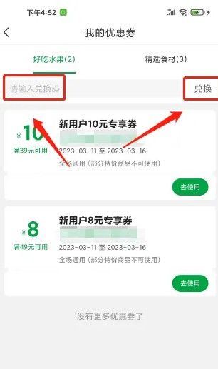 进入我的优惠券,输入兑换码,点击【兑换】。