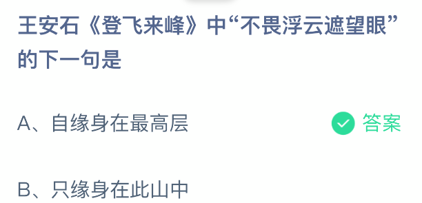 以上就是王安石《登飞来峰》中“不畏浮云遮望眼”的下一句是,支付宝蚂蚁庄园2026年1月2日答案最新,更多精彩内容,请点击关注更新!