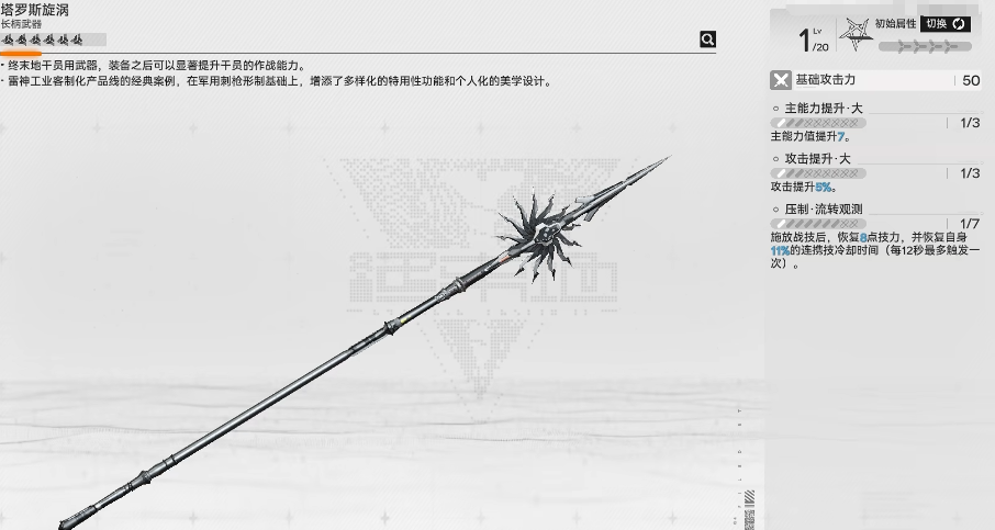 接下来为大家介绍的就是塔洛斯漩涡,这在当前是属于一个非常不错的长炳武器,它在基础的攻击能力上面可以造成的能力数值提升7%之后,攻击能够达到6%的提升,在压制流转观测这个技能效果上面,可以让他在使用自身站立的时候有足够的精力恢复,精力在8点恢复了之后,可以给他恢复自身11%的冷却时间,当然了这个冷却加速是只能体现在连接器的使用效果上面,每12秒的情况下,这个技能最多触发一次,虽然这个武器技能在使用的情况下,中间需要达到的冷却时间比较多,但是能够给角色恢复记忆的武器还是非常少的,所以放在这里的话能够使用的空间也比较大。