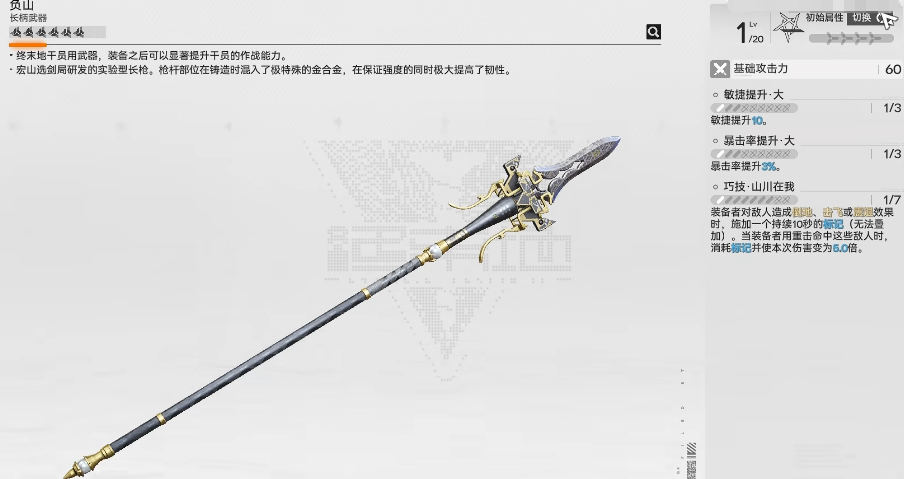 接着为大家介绍的就是这个负山,在当前装备了之后,对于角色的敏捷提升达到了10%的效果,而且在暴击概率上面也提到了5%,这还是一个初始的百分比,所以后期才达到了等级切换之后,它能够达成的数值会比这个更高一些,同时能够触发的技能叫做山川在我,利用这个武器可以带来的技能是造成倒地或者是击飞这类效果的话,会让敌人在持续10秒的时间之内有一个标记,这个标记虽然不能进行附加,但是在装备者用重击攻击这类效果标记的敌人当中,可以消耗他的标记层数能够达到五倍的伤害数值进行积累。