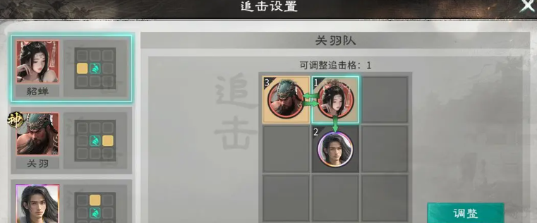 而藤甲兵的话同样是放前面,这上面大家要注意郭嘉他对于这几个兵种的需求没有那么高,而貂蝉的话不仅要踩到关羽的这个追击格子,还要踩到郭嘉的追击格子,这样的话可以二次进行释放技能,关羽的话就去踩貂蝉的追击格,这样的话可以根据毕业的效果带来天赋加成,因为这里关羽他可以触发自带的天赋,所以在其中根据不同的技能卡搭配的话,建议大家可以带万军取首作为一个主动技能,这样造成的单体伤害会让他的兵力低于50%的时候,自己的伤害提升50%。