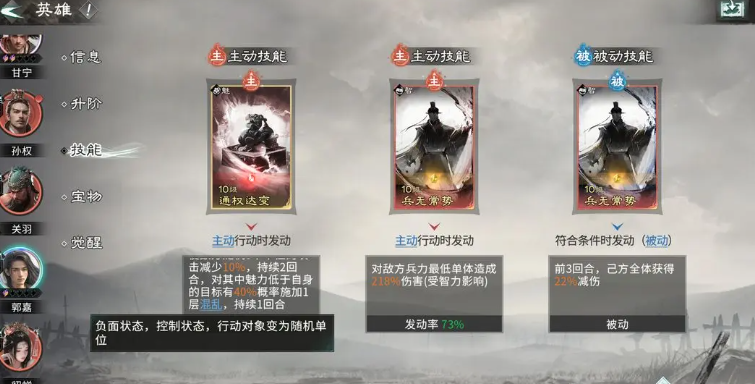 那么在这样站位的时候,大家注意貂蝉的天赋可以带来的是闭月之貌效果,通过这个天赋的能力,可以给对方的一些男性武将造成的伤害自然是会提升更多一些的,而另外利用貂蝉的追击造成一定伤害的时候,其中20%的伤害还可以变成其他的能力,这类能力对于貂蝉的效果来说是可以增加增益的,如果没增加魅力效果达到2点的话,根据这里的能力还可以得到增伤的数值,而在郭嘉的天赋效果上面带来的则是十胜十败,在其中根据他主动技能发动的一些能力,可以根据所有敌方的英雄拿到这里压制的效果。