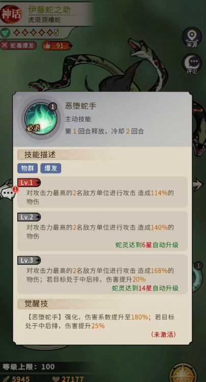 伊藤蛇之助在现在的强度当中其实利用毒素能力来积攒多次的输出是非常不错的,利用蛇毒爆发可以带来的各种能力也是他主打的一类输出途径,恶堕蛇手这个技能作为他最基础的物理群攻技能,可以带来的爆发能力也很强,输出的时候可以对攻击力最高的2名敌方单位进行攻击,造成114%的物伤,后期升星之后如果攻击的目标处于中后排,伤害则会有提升20%,恶堕蛇手这个技能在强化之后,伤害系数提升至180%;若目标处于中后排的话,觉醒的伤害数值会提升25%。