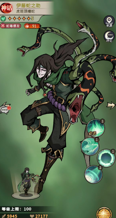 所以在这个阶段当中伊藤蛇之助的能力是能够跟类似小青这类角色搭配在一起的,且此时给到的蛇毒叠层也是最符合持续输出需要的能力,这里一般给到的一层蛇毒,会让敌人受到的治疗降低30%数值,然后在敌人受到我方角色攻击的时候,还可以额外附加伊藤蛇之助攻击当中10%的伤害,死亡时这个效果才会被移除,而根据这个狩猎本能技能的强化,其中的增益效果提升至25%攻击和15%暴击之后,大家能够给他的挂毒能力带来更多的叠层效果,所以放在同类角色当中大家用伊藤蛇之助最注重的就是他的最后这个被动技能,特别是在跟小青、小白进行阵容组合的时候,其他的技能不生效不会影响太大,而狩猎本能是一定要触发生效的,要不然对于后期伊藤蛇之助的持续影响都会直接导致挂毒不足,输出就不够哦。